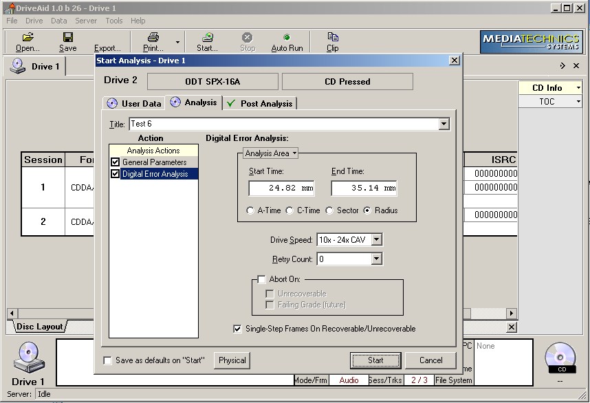 Media and Drive Identifier - The Area at the top of the Start Analysis screen shows the Drive #, the Drive Model # and the Media type that has been initialized in that drive.
